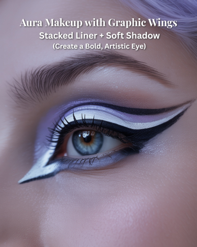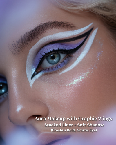 If you’re feeling bold, take your aura-inspired look to the next level with layered eyeliner wings and graphic designs. This style uses a mix of soft, spiritual tones—like lavender and white—with exaggerated black and white liner to create stacked wings that really make the eyes pop. It’s part aura, part editorial, and 100% expressive. Ideal for photoshoots, festivals, or anytime you want your makeup to feel like art.